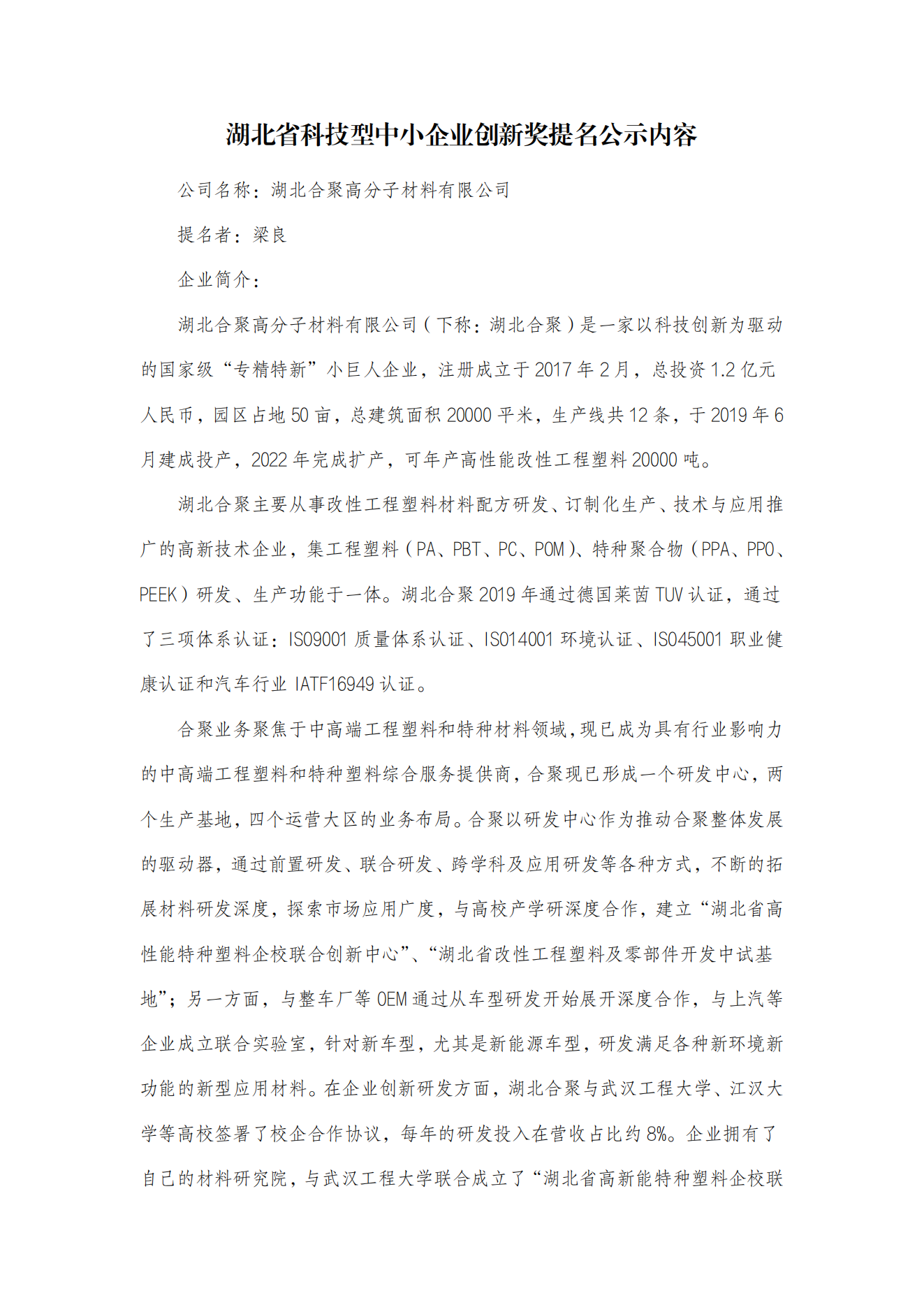 湖北省科技型中小企業(yè)創(chuàng)新獎(jiǎng)提名公示內(nèi)容